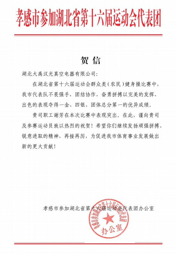 下圖為湖北省第十六屆運(yùn)動(dòng)會(huì)代表團(tuán)辦公室發(fā)來(lái)的感謝信!